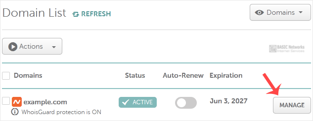 3. Under Domain List, you can see a list of your domains. In front of your domain, click on Manage.